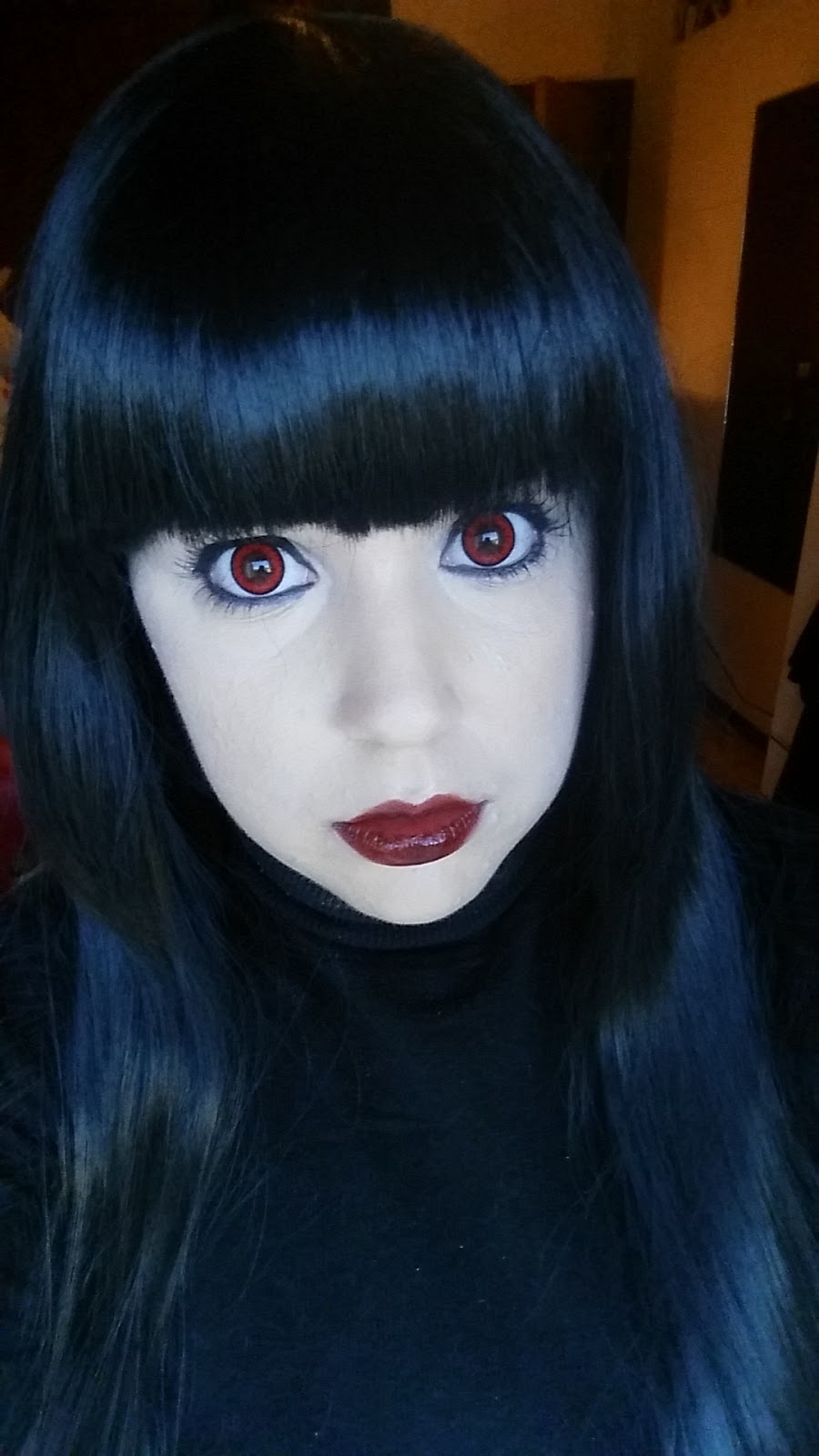 Eu tentei manter a maquilhagem dos olhos o mais simples possível, só utilizei bastante negro, porque assim pensei que deveria ser para uma personagem como esta. Para além disso, apesar de a personagem não ter batom, eu utilizei um para dar um toque mais sombrio à personagem